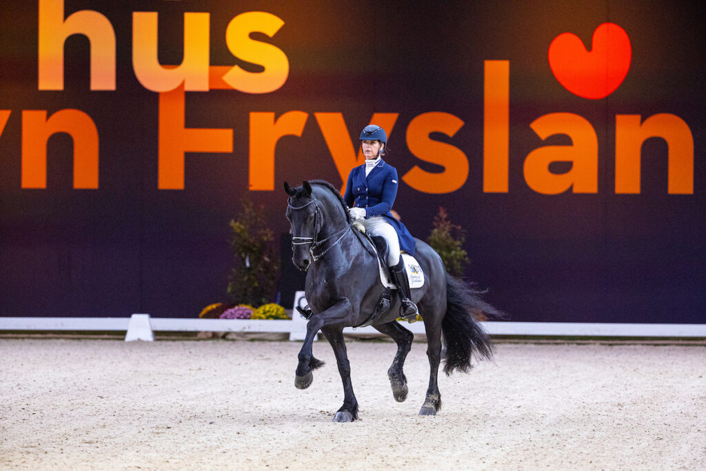 Elias 494 was niet de enige KFPS (stamboek)hengst die zaterdagavond een danspasje in de arena waagde. Ook Lisanne Veenje en Wirdmer fan ‘e Boppelannen Ster Sport Elite (Beart 411) reden mee in de Grand Prix Freestyle en scoorden 65,035%. Voorafgaand aan de rubriek verschenen er zelfs meerdere KFPS stamboekhengsten in de ring als onderdeel van de show ‘De Friezentrein’. Onder leiding van Christa Larmoyeur lieten onder andere Arent 515 met Marijke Boelen, Ulbe 506 met Leonie Evink, Martzen 521 met Harmina Holwerda en Epke 474 met Sabien van Loenhorst zien dat het Friese ras zijn hoef niet omdraait voor een spectaculaire show.