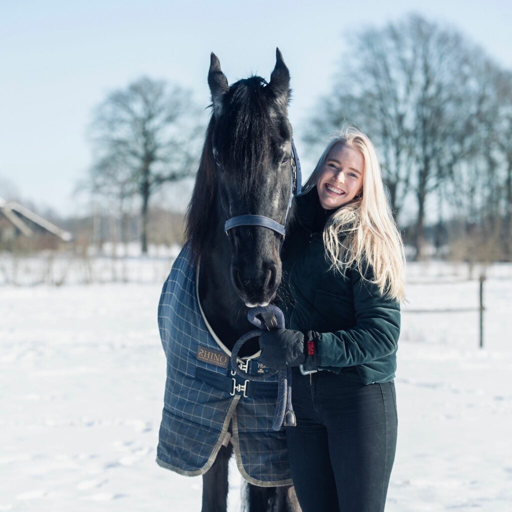 De amazone wist één ding zeker: haar volgende paard moest en zou een Fries worden. ‘In mijn ogen zijn friezen lekker allround. Ze zijn leuk om mee te dressuren, maar het is ook een ras om heerlijke buitenritten mee te maken. Ik had nog nooit op een fries gereden, maar toch begon ik de zoektocht met een duidelijke missie: een grote jonge friese ruin. Het liefst wel al beleerd, maar al snel kwam ik erachter dat de prijzen erg hoog waren, dus deze eis werd bijgesteld’, lacht ze. ‘Ik benaderde verschillende grote stallen, maar de meeste jonge ruinen stonden in september nog op het land, dus ik kon niet op veel plekken terecht. Toch heb ik een aantal particulieren en stallen gevonden die wel wat voor mij hadden staan.’