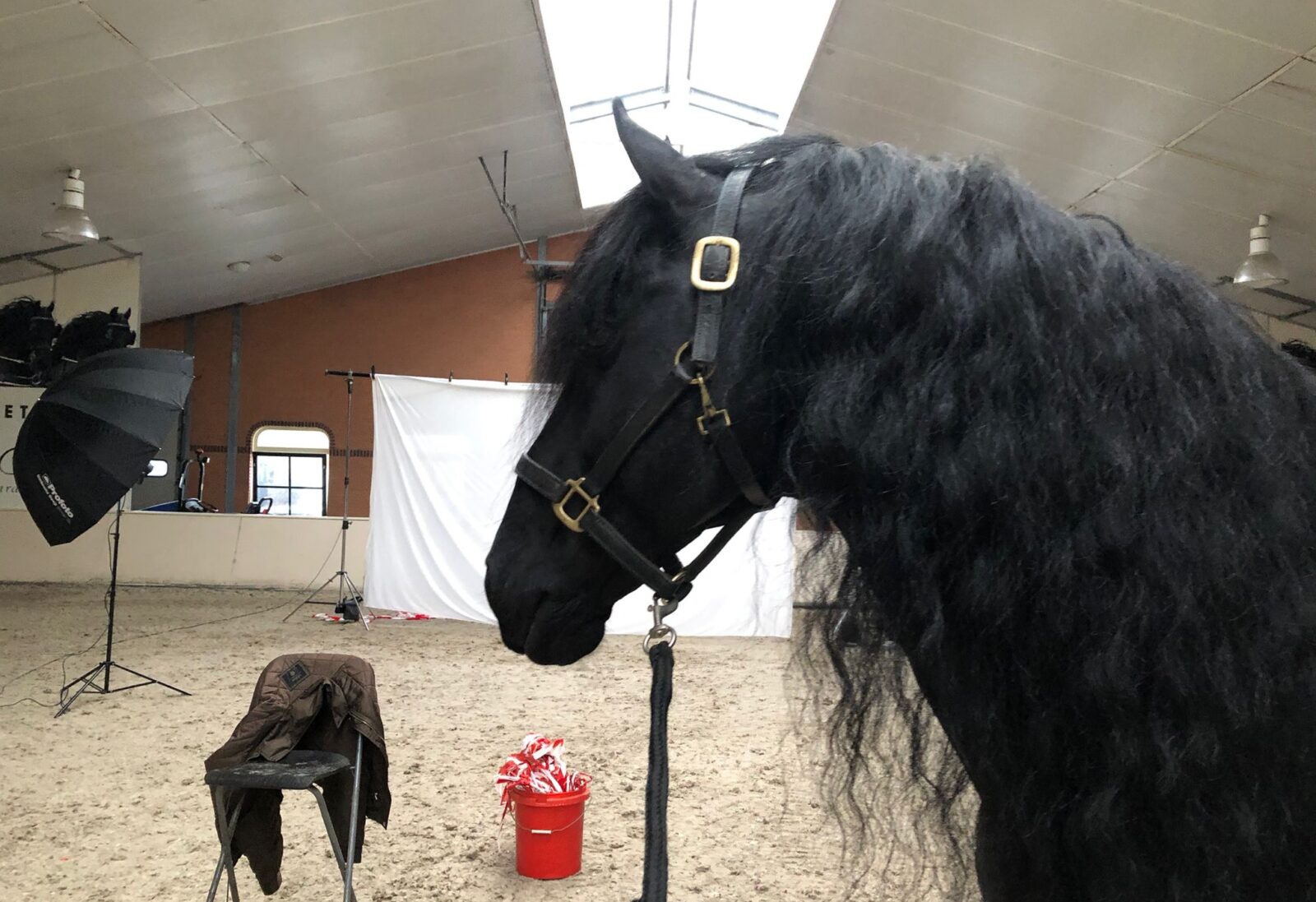 Gelukkig was de knappe hengst snel weer rustig, en vanaf dat moment ging het allemaal van een leien dakje. ‘Hij stond als een standbeeld en verdraaide alleen af en toe een oortje. Fotografe – eigenlijk kunstenares – Eva Roefs vond het allemaal spannender dan Sjaak, want bij de vorige shoot, met een Gelders paard, was het paard totaal gestrest geraakt. Dat ging dus niet heel lekker … Maar Sjaak gedroeg zich dus na die eerste escapade voorbeeldig.’