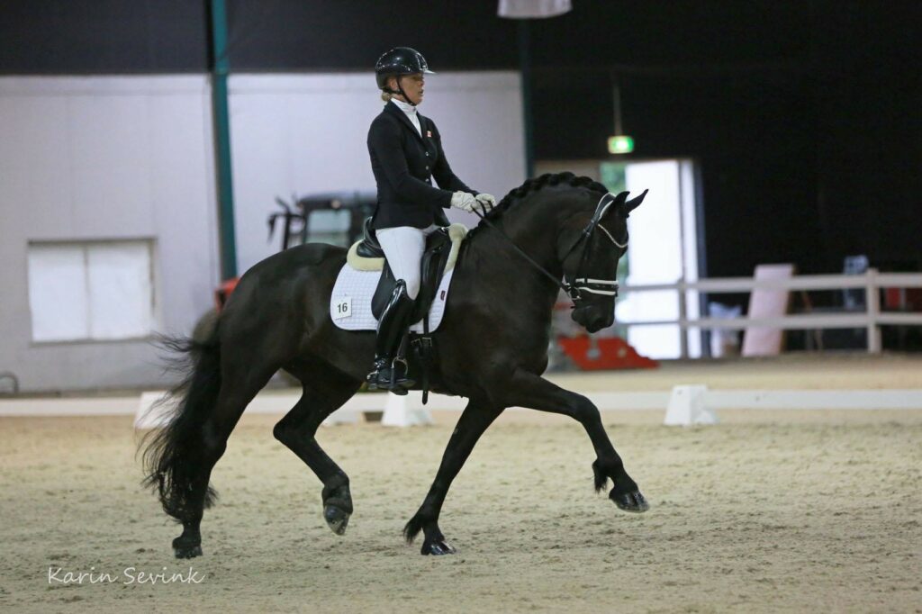 Concours Lunteren is voor Naomi altijd een bijzonder concours geweest. Ze reed er zelf al eens eerder bij de Young Riders, maar haar moeder natuurlijk ook. Vijf jaar geleden werd zij nog wel eens bijgestaan door Marcel van Bruggen uit Varik en destijds waren ze even bij hem te trainen om zich klaar te maken voor Lunteren. Aldaar liep ook Gerrel Vink rond die niets met tuigpaarden had, maar als dressuurruiter ervaren was. Toen hij de Friese Merle in het oog kreeg liet hij weten: “Zo’n goede Fries wil ik ook wel eens onder het zadel”. Dat was niet aan dovemansoren gericht en Margreet gaf hem de vrije hand op CH Lunteren dat jaar met de merrie te starten in de rubriek tuigen onder het zadel. Deze uitnodiging werd geaccepteerd. Het werd zijn eerste keer op een Fries, ook was zijn eerste keer op een tuigconcours. Niet alleen de liefde voor het Friese paard wakkerde aan met deze actie, ook de liefde tussen Gerrel en Naomi ontstond in deze periode, waarvan komende zaterdag een vijfjarig verkeringsjubileum gevierd mag gaan worden!
