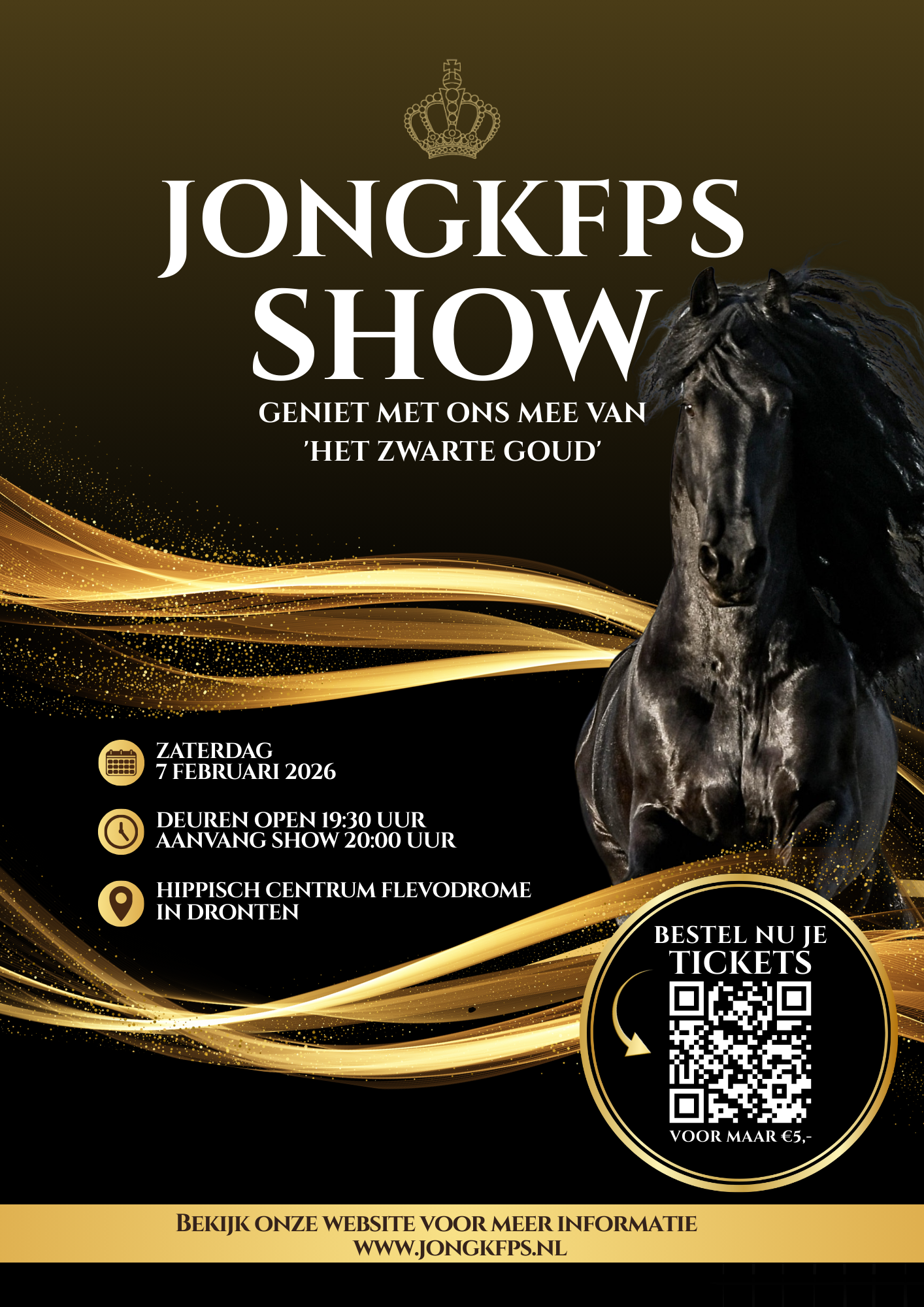 Zaterdag 7 februari zet het JongKFPS met de showo ‘Het Zwarte Goud’ het Friese paard in de spotlight. In Dronten bij Hippisch Centrum Flevodome is iedereen vanaf 19.30 uur welkom. Tickets zijn uitsluitend online verkrijgbaar; er is geen kaartverkoop aan de deur. Je hoeft geen lid te zijn van JongKFPS of KFPS om de show te bezoeken – iedereen is welkom!