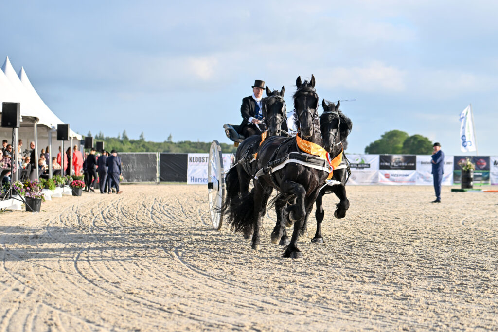 Het klavertje drie rijden is één van de moeilijkste disciplines in de tuigsport. De kunst is een tweespan te besturen, met daarvoor een derde paard, wat zich bij voorkeur vrij en blij showt voor het span uit. Niet elk paard is geschikt als voorpaard, want enige ‘go’ is beslist op zijn plaats. De kandidaten voor het kampioenschap, verreden op het jubilerende concours hippique in Dokkum hadden voldoende ‘go’ en lieten een prachtige strijd zien, waarbij Age Okkema ietsje eerder dan wellicht vooraf gewild de uitgang koos en de wedstrijd staakte. Het trio van Holtrop bestaande uit Egberth van de Zonschate (Jasper 366) als voorpaard en daarachter Bettina H. (Hinne 427) en Hessel fan ‘e Stjelpdyk (Andries 415) nam het in de overkamping op tegen de eveneens uitstekend gaande combinatie van Udo de Haan bestaande uit Het Swarte Paerd Romke SVH (Alke 468), Het Swarte Paert Sierd P.J. (Dries 421) en Rinse P.J. (Thorben 466). Qua beweging ontliepen de beide elkaar zeer weinig, met beide ook een voorpaard wat ietsjes los in de strengen liep, maar de totale vriendelijkere en meer ontspannen uitstraling van Holtrop gaf bij de juryleden de doorslag.