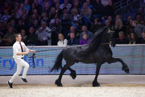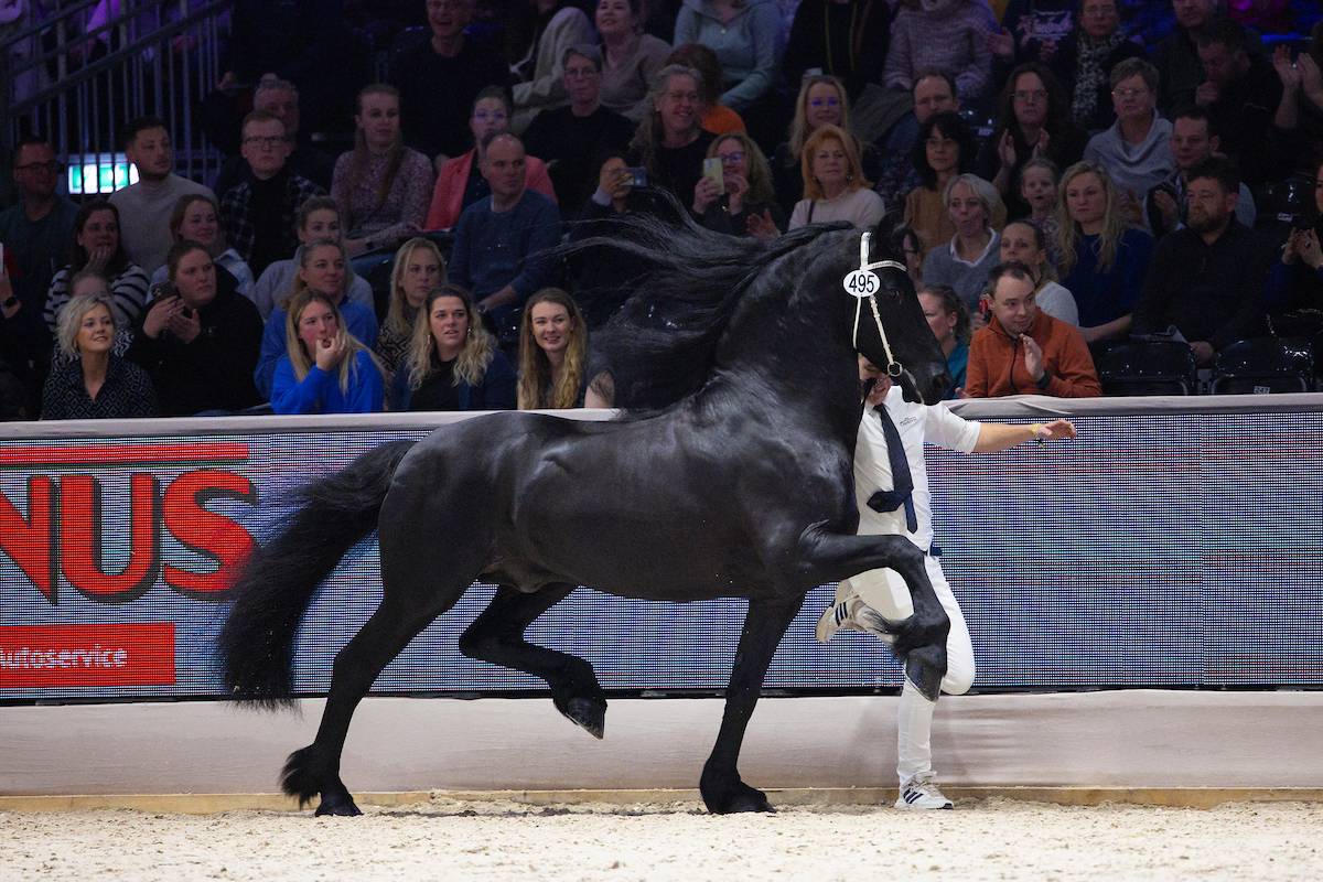 Het in grote getale toegestroomde publiek kon genieten van maar liefst twee rubrieken oudere hengsten. ‘Een genot om naar te kijken’, aldus Sabien Zwaga. ‘Veel respect voor deze hengsten.’ Uit het eerste deel van de rubriek werden Jurre 495 en Jehannes 484 uitgenodigd, Alwin 469 volgende uit het tweede deel. ‘Alwin 469 met zijn fans, applaus, veel ras, kippenvel en spectaculair voorbeen.’