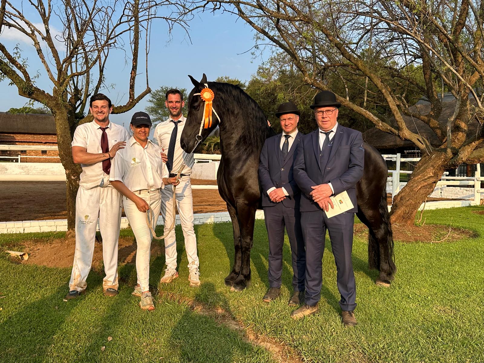 De keuringsreis in Zuid Afrika startte op Stoeterij Adelprag. Daar reed Chere Burger de achtjarige Eminence v.d. All Blacks Ster AA (Alwin 469 x Jasper 366) met een ‘fenomenale draf’ naar 80 punten in de IBOP en daarmee maakte de in Denemarken geboren hengst van Nicky Pienaar promotie van A naar AA. Merrieveulen Felina (Reinoud fan ‘e Homar x Tjalf 443) kreeg met haar fraaie front en taktmatige, ruime stap een tweede premie. En de 25-jarige Anders 451 maakte indruk. ‘Hij is in een mooie conditie en nog spijkerhard’, licht Jan Hellinx toe. ‘Hij is al wat ouder, maar heeft nog steeds een actieve stap en go en ruimte in draf. In de lange lijnen werd hij dansend voorgesteld.’ Ook de drie veulenboekhengsten bleken om blakende gezondheid. Reinoud van ‘e Homar Ster Sport Elite AA (Beart 411 x Nykle 309) is 20 jaar en verricht al 10 jaar zijn dekdiensten. De rassige Tizian fan Ass Ster Sport Elite AAA (Epke 474 x Brandus 345) ombineerde zijn echte hengstenuitstraling met moderne opdruk, ruimte in stap en een draf met veel vermogen. De achtjarige Fedde Ster AAA (Meinte 490 x Norbert 444) showde veel behang, een goede bovenlijn, een vlotte stap en een draf met voldoende balans en ruimte.