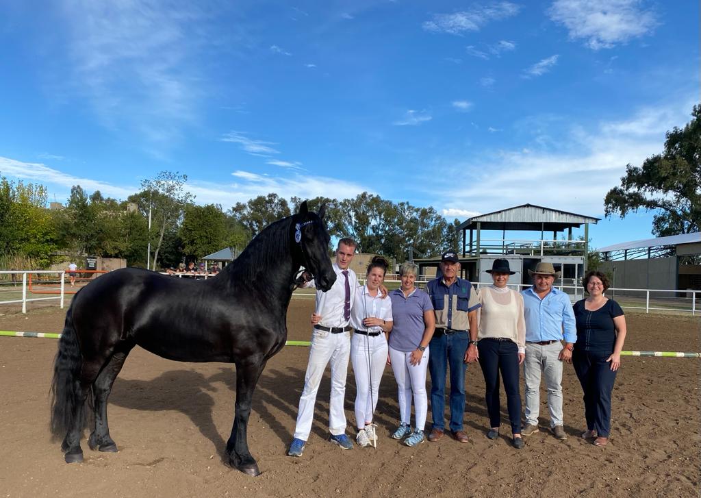 De Horse and Wine show in Zuid Afrika leverde op vrijdag 25 maart een Kroonmerrie op. Udine fan ‘t Hoogeland (Wybren 464 x Harmen 424) werd in haar IBOP door juryleden Sabien Zwaga en Annemieke Elsinga beloond met 77 punten. ‘Een merrie die voldoende stapt en een snel en goed ondergebracht achterbeen in draf liet zien. In de galop kon ze wat meer souplesse tonen’, vertelt Sabien over de achtjarige merrie van Adelprag Stud van Niekie Pienaar. Amazone Chere Burger presenteerde de merrie onder het zadel. Tijdens de keuring aan de hand kreeg Udine een een eerste premie tijdens haar tweede presentatie promotie naar Kroon.