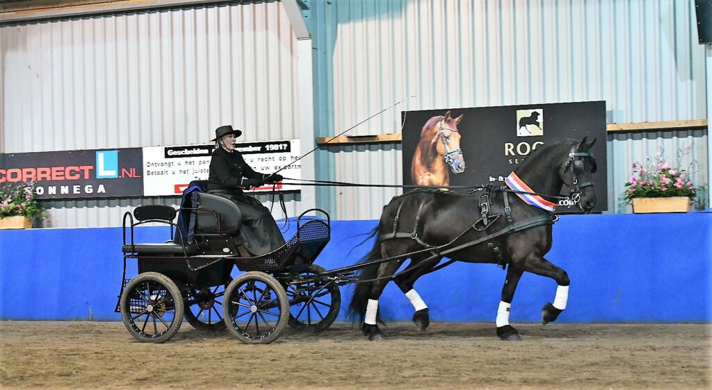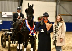 De finale-avond kende nog een prachtig intermezzo vlak voor de prijsuitreiking. Mensters Wilma Reijenga en Marrit de Vries verruilden de kar voor het zadel en zo reden ze met Jilles fan Sparjeburd (Tiede 501) en Guusje fan Westermeer (Maurits 437) een prachtige pas-de-deux, samengesteld met behulp van Lisanne De Jong-Veenje.