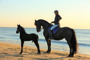Ze waren woensdagavond 22 april een bezienswaardigheid op het Noordhollandse strand: Lora Burger maakte met haar Friese merrie Eefke V. (Fabe 348) en haar zes weken oude hengstveulen Mink van Purmer (Nane 492) een ritje over het strand. ‘Het hele strand was blij.’