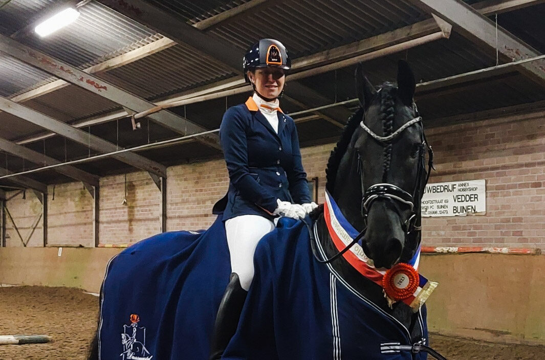 Marjan is afgelopen oktober op Zenith gestapt om hem te rijden. ‘Hij is van Renske Groen, één van mijn leerlingen. Eigenlijk zeiden we voor de grap dat we Zenith zouden gaan starten.’ Na de voorrondes stonden ze nog op de vierde plek. ‘We worden vast laatste in de finale, er zitten ook drie sterke KWPN-ers in de finale’, voorspelde Marjan. ‘We hadden er nooit aan gedacht dat we ook nog kampioen zouden worden.’ De combinatie heeft een uitnodiging voor het Nederlands Kampioenschap op 3 maart in Ermelo en daar heeft Marjan zin in. ‘We gaan er alles aan doen, maar zijn tevreden met een plek in de top 10.’