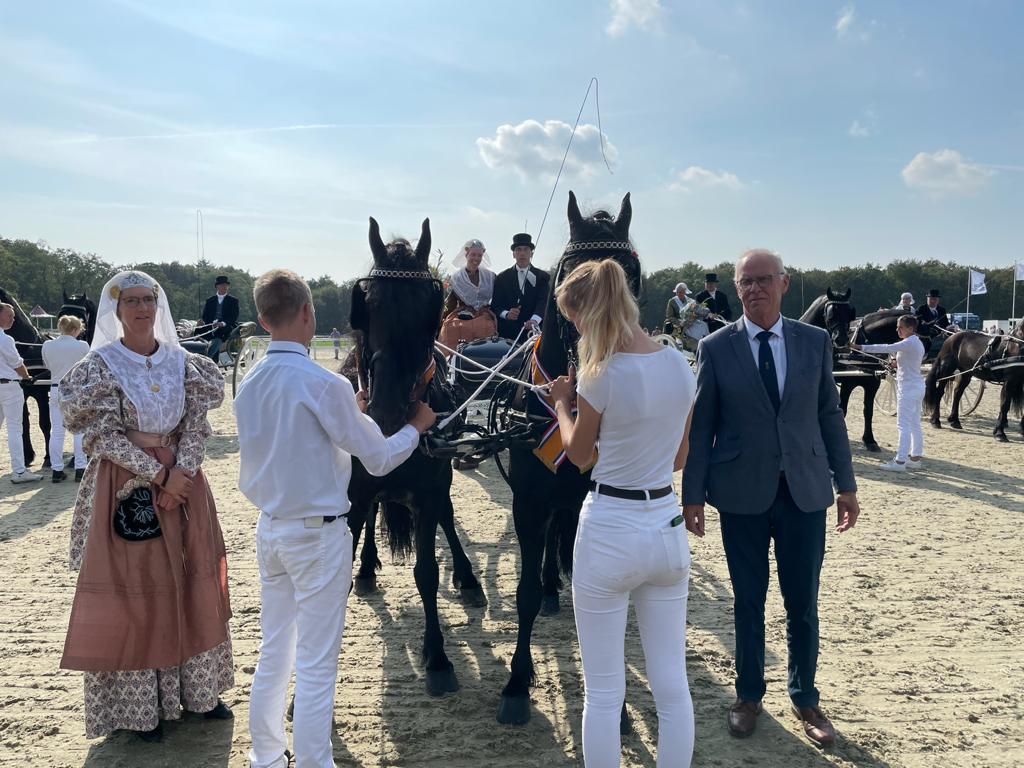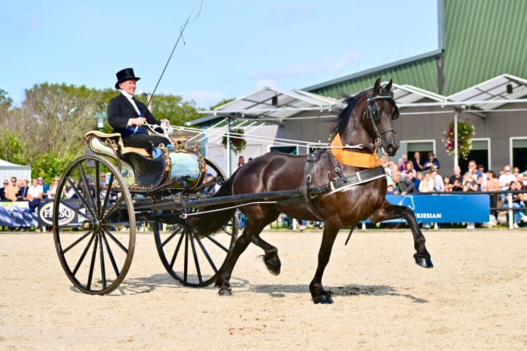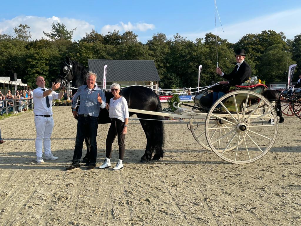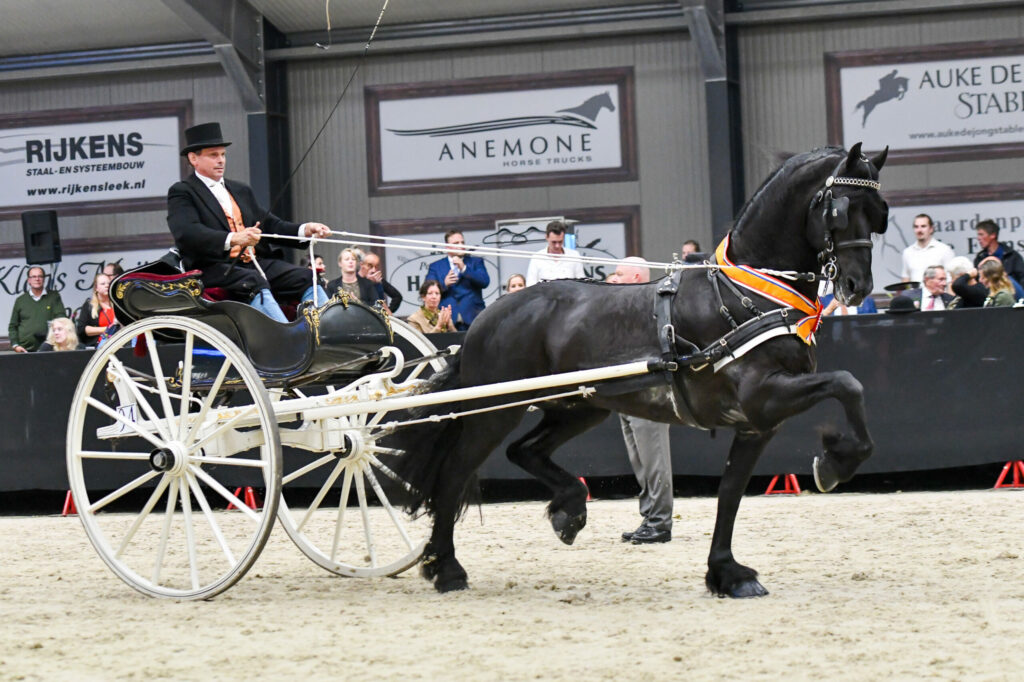 Met een hele constante fraaie presentatie wist Modelmerrie Susanne (Norbert 444 x Wikke 404) met Hendrik Eppinga het kampioenschap merries voor de sjees winnen. ‘Ik voelde wel druk, maar moest zorgen dat ze in balans zou blijven’, gaf Hendrik aan bij speaker Henk Dijkstra. ‘Ik heb mijn zenuwen wel in bedwang kunnen houden.’