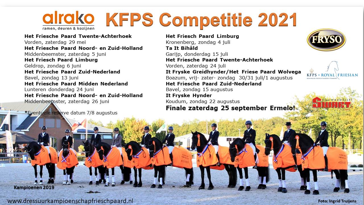 De organisatie van de Alrako KFPS competitie 2021 heeft de planning voor de selectiewedstrijden aangepast. De allereerste selectiedag staat gepland voor 29 mei in Vorden bij de fokvereniging Het Friesche Paard Twente-Achterhoek.