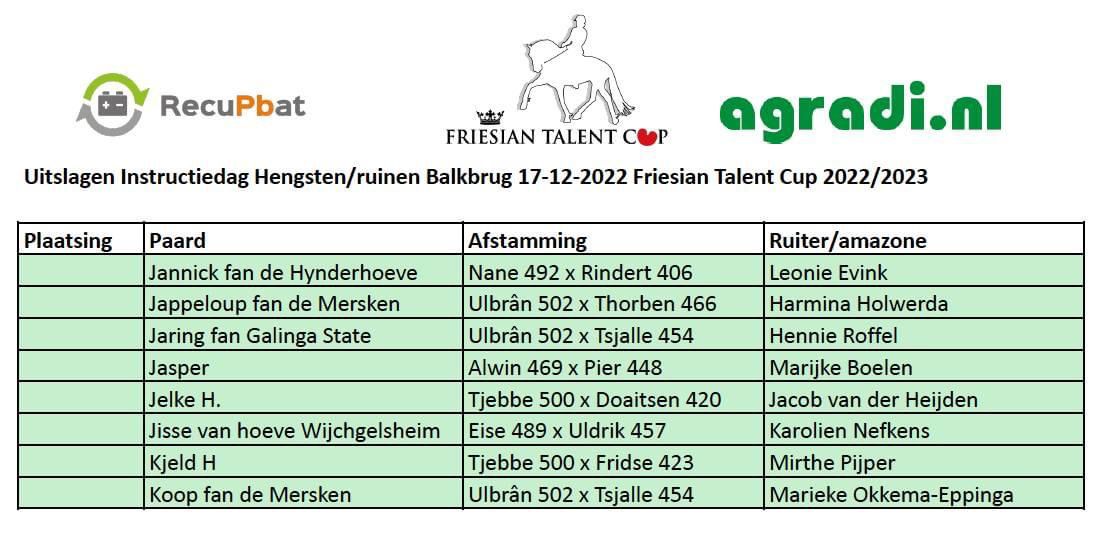 Het middagprogramma van de Friesian Talent Cup selectiedag op zaterdag 17 december in Balkbrug heeft ook acht hengsten opgeleverd voor de finale in Leeuwarden. Hiermee zijn alle finalisten bekend die zullen strijden op donderdag 12 januari in het WTC.