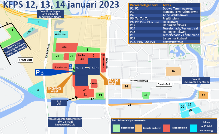 Via bijgaande plattegrond vindt u een overzicht van de parkeerruimtes die beschikbaar zijn voor onze bezoekers. Er bevinden zich door Leeuwarden verschillende parkeerroutes; Oost en West. Deze routes zijn via grote gele borden met daarop de tekst ‘FRIES PAARD’ aangegeven en worden begeleid door parkeerwachters. De maximale loopafstand van de verste parkeerplaats naar het WTC Expo bedraagt +/- 15 minuten. U kunt via zowel Ingang West als via het Westcord Hotel aan de Oostzijde het WTC Expo gebouw binnenkomen.