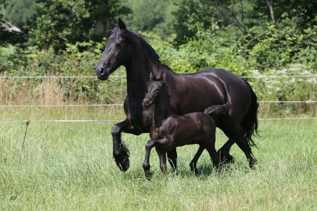 Het veulenseizoen is losgebarsten en veel Friese veulentjes dartelen alweer in de wei. Voor de fokkers altijd een spannend moment of merrie en veulen de bevalling goed doorstaan. Margé Emmens in het Drentse Marwijksoord heeft pleegmerries die klaarstaan mocht een fokker met een moederloos veulen te maken krijgen.