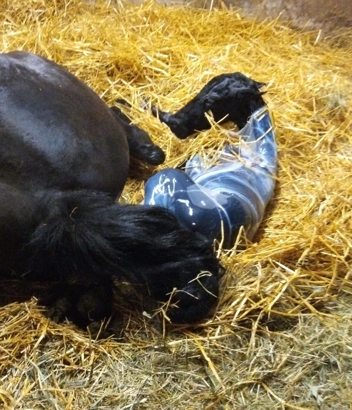 Door voorzichtig wat te trekken aan het veulen kreeg de merrie snel weer extra persdrang waardoor ze ook weer wilde gaan liggen. Ondanks het vertraagde geboorteproces startte het veulen gelukkig vlot op; het ademde en begon ook al vrij snel te bewegen en het hoofdje op te tillen. ‘Door onder het staartje te gluren wisten we dat het een hengstveulen betrof, hetgeen de eigenaren ook gehoopt hadden,’ aldus De Boer.