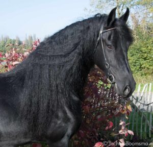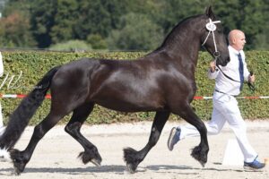 Trijntje fan Loohuis Ster AA (Alwin 469 x Tsjerk 328) was de eerste Friese merrie die specifiek bedoeld is om mee te fokken. ‘Trijntje kreeg vier veulens, twee bij vorige eigenaren en twee bij ons. Haar veulen van vorig jaar noemden we Tika Van den Toverhoed (Tymen 503, foto bovenaan bericht). Zij stond nog niet echt te koop, maar is verkocht aan liefhebbers uit Friesland die er het hele eind voor naar België reisden om haar te bezichtigen.