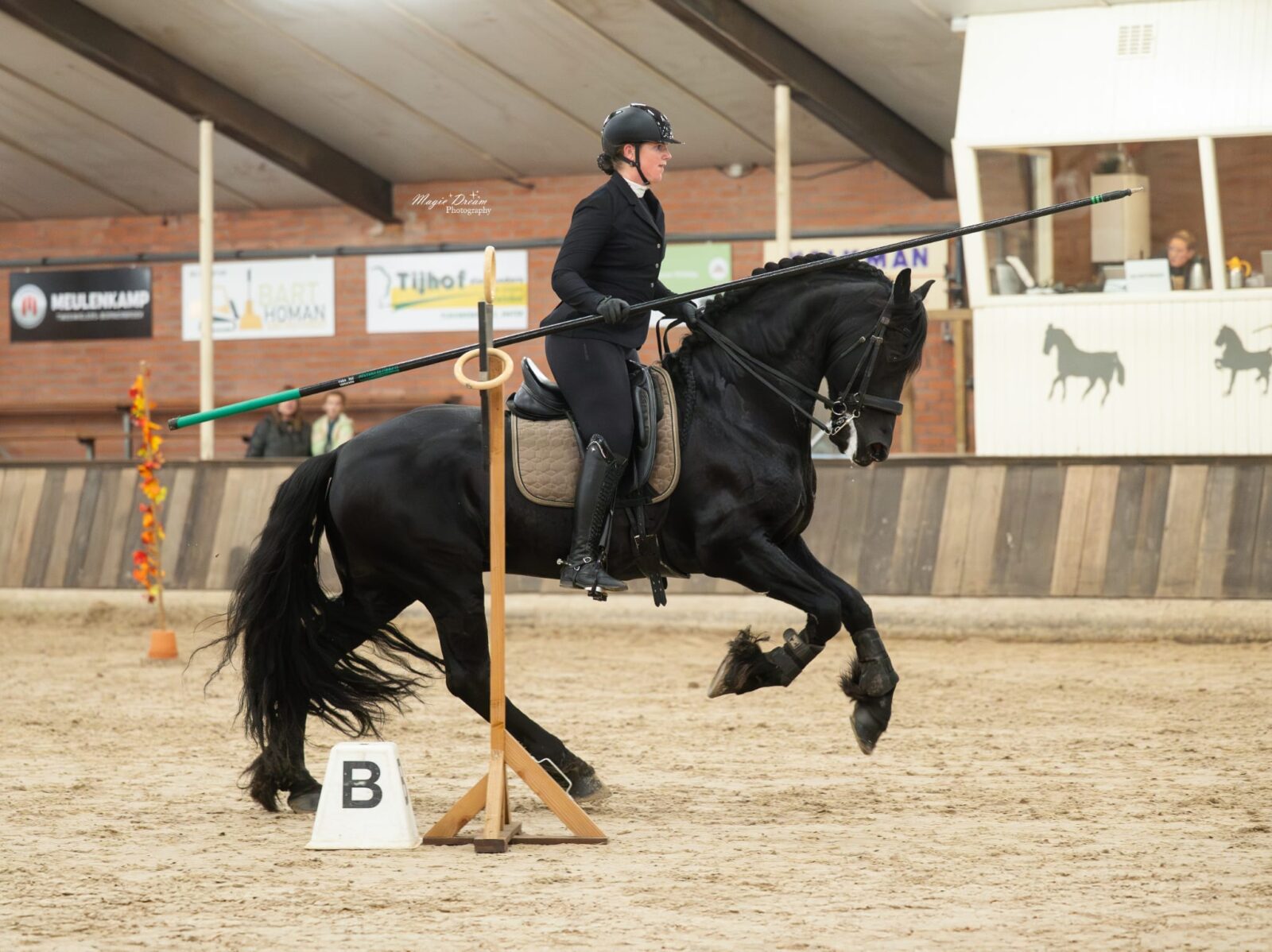 Gisteren hebben Bodien Grijpstra en haar Theodore (stamboeknaam Fonger T fan ‘e Boppelânnen Ster Sport Elite v. Loadewyk 431) hun debuut gemaakt in de Master-klasse (level 4) van de Working Equitation, de hoogste klasse in deze discipline, die ook wel ‘dressuur met hindernissen’ genoemd kan worden. Een geweldige prestatie, want nog nooit heeft een Fries paard deze hoogste klasse bereikt.