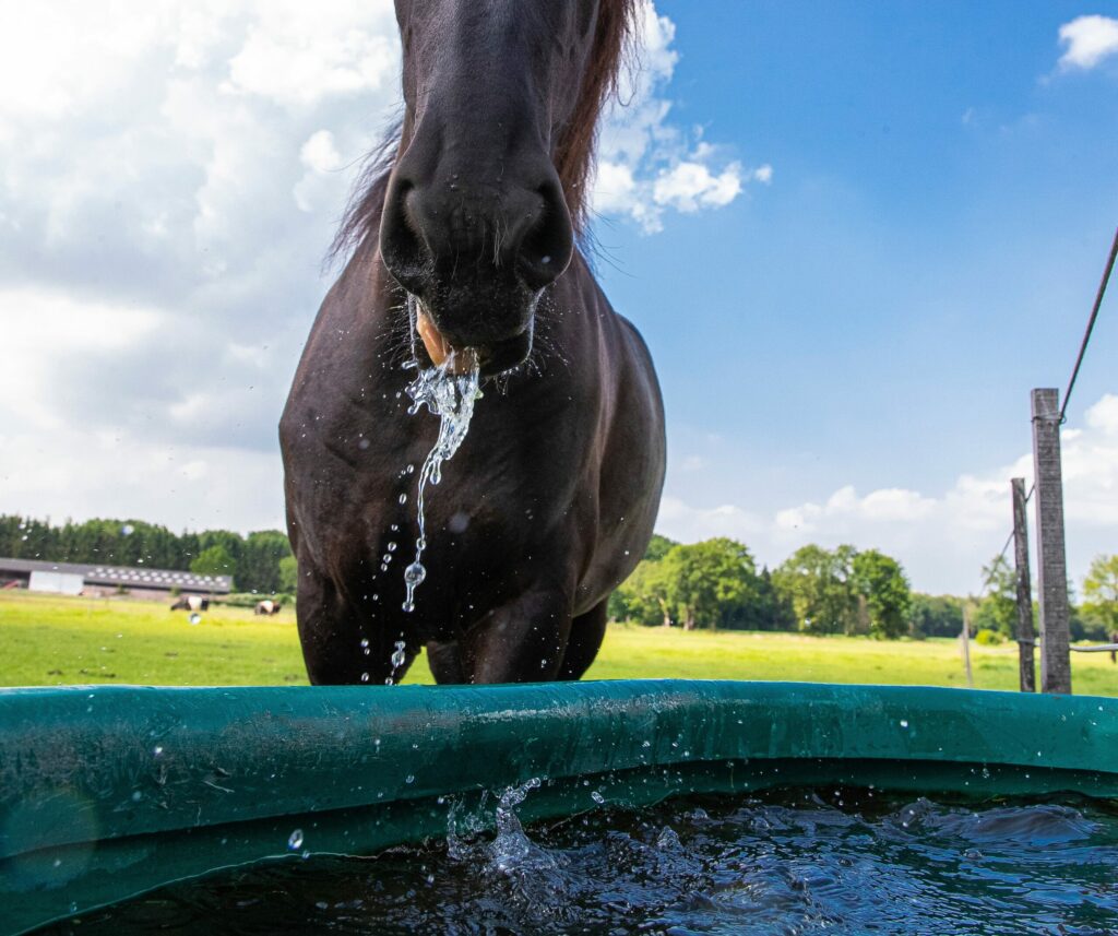 Paarden hebben van nature een lagere optimale omgevingstemperatuur dan mensen. Bij temperaturen hoger dan 27 graden is het al gauw te warm voor een paard. Zorg dat je paard de schaduw kan opzoeken en dat er de hele dag genoeg én vers drinkwater beschikbaar is. Een paard drinkt met dit weer soms wel 50 liter water per dag. Paarden kunnen de hitte best goed kwijtraken door te zweten, dat betekent tot wel 15 liter vochtverlies per dag.
