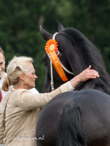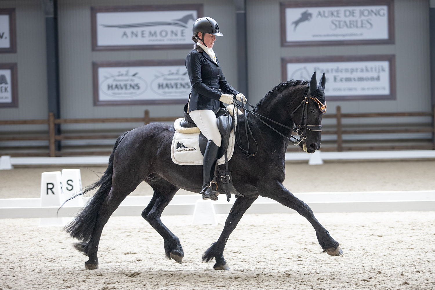 En zo kwam amazone Janet Ijntema in het zadel van Vlamke terecht. ‘Janet heeft haar handen vol gehad aan Vlamke, ze is echt een balletje energie.’ De Jasper 366 nakomeling had nog nauwelijks ervaring buitenshuis, dus naast het aanleren van de oefeningen voor de Z-dressuur moesten ook voor het eerst witte hekjes en juryhokjes getrotseerd worden. ‘Maar Janet had het volste vertrouwen in Vlamke, ze gingen het gewoon samen proberen en kijken hoe ver ze zouden komen’, vertelt Hanneke. ‘Ik ben ontzettend trots op wat Janet met onze frummel heeft weten neer te zetten, ze heeft haar laatste twee winstpunten voor het predicaat binnengehaald met een eerste prijs! Van mij had Janet haar naam ook op het predicaat gemogen, zij heeft de prestatie geleverd.’