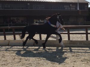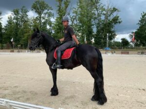 Juryleden Willem Sonnema en Wil Thijssen reden zo’n 3000 kilometer om in Frankrijk de Friese paarden te keuren. Een hele reis die ze graag maakten, vertelt Wil. ‘We zijn blij dat het toch kan.’ Ze begonnen zaterdag in St. Etienne waar ze een kleine 13 paarden te zien kregen. De meest opvallende en daarmee dagkampioen werd de zevenjarige Wieke fan nico stables Ster, een dochter van Mewes 438 die een aantal jaren in Frankrijk ter dekking heeft gestaan. Wieke (mv Jerke 434) had een mooie romprichting en ruim voldoende rastype, maar maakte vooral indruk met een overtuigende, taktmatige en ruime stap. In draf liet de merrie van Céline-Jade Coroller en gefokt door J.F.M. van den Boogaert uit Weert, een sterk achterbeengebruik met veel buiging zien.