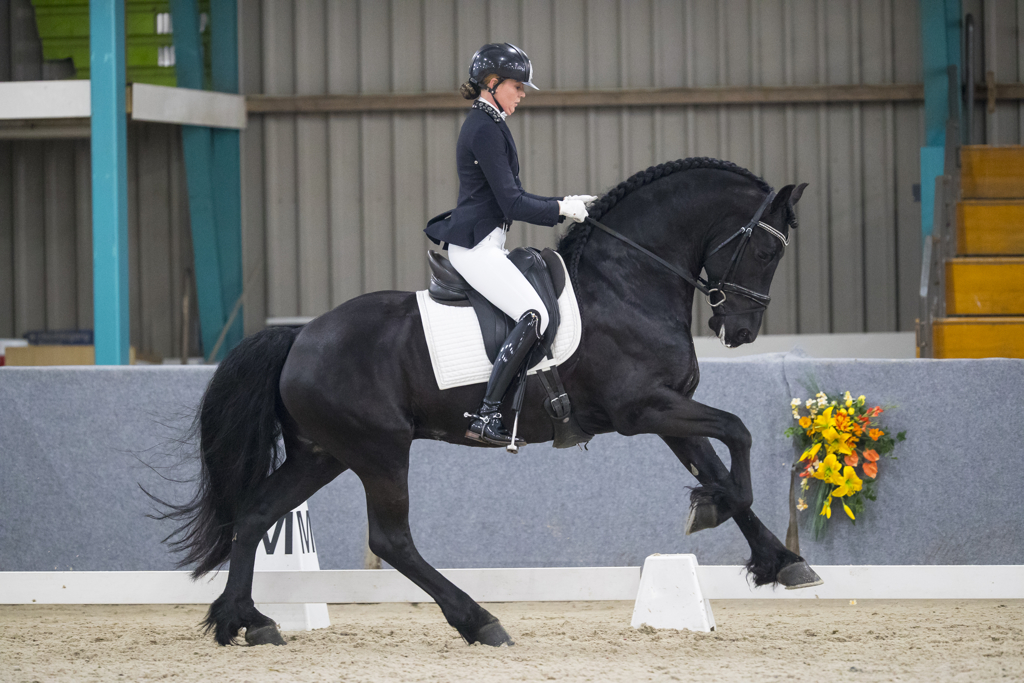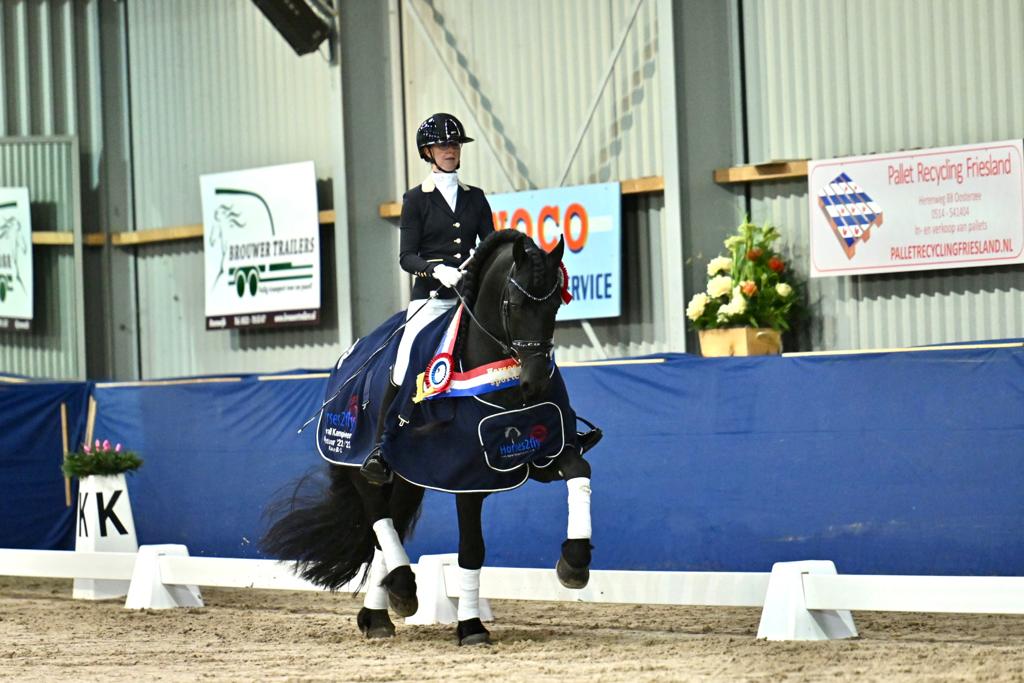 Isabelle Vroomans haalde zaterdag met Vajen T. Horsea (Tymon 456) de Zilveren Zweep in de lichtere klassen binnen. Ook op zondag reed ze zich in de kijker. Ze won de klasse M1 met Jinte G. fan ‘e Rydwei (Uldruk 457) dankzij een heel netjes en ontspannen gereden proef. Afke Weidenaar kreeg met MGPNGP Maile fan Klaeiterp (Stendert 447) de reservetitel.